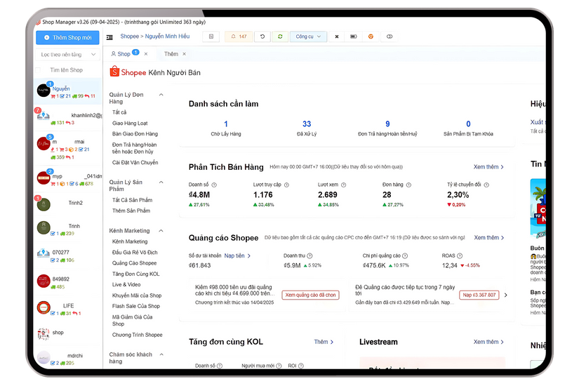Đăng nhập không giới hạn số lượng shop Shopee · TikTok Shop · Lazada. Tất cả đơn hàng, chat, sản phẩm hiển thị song song — không còn nhảy tab.